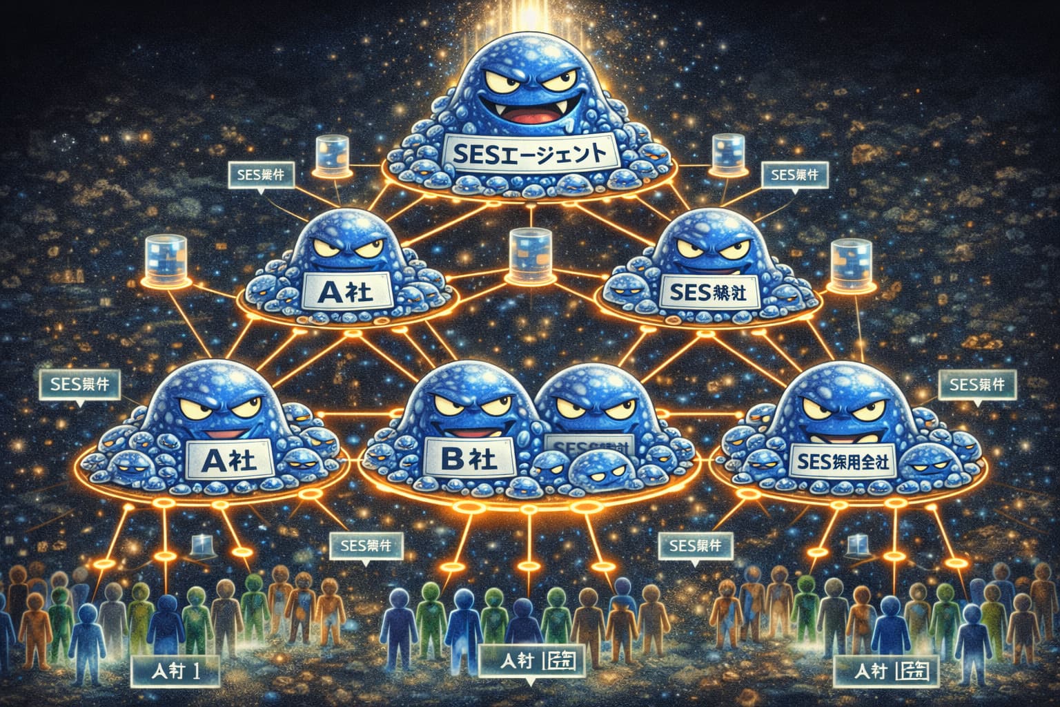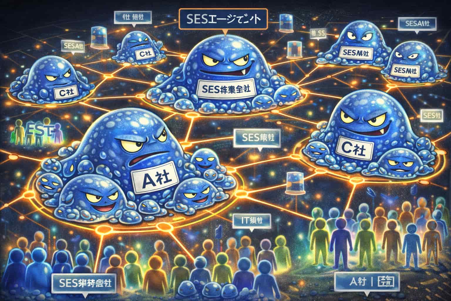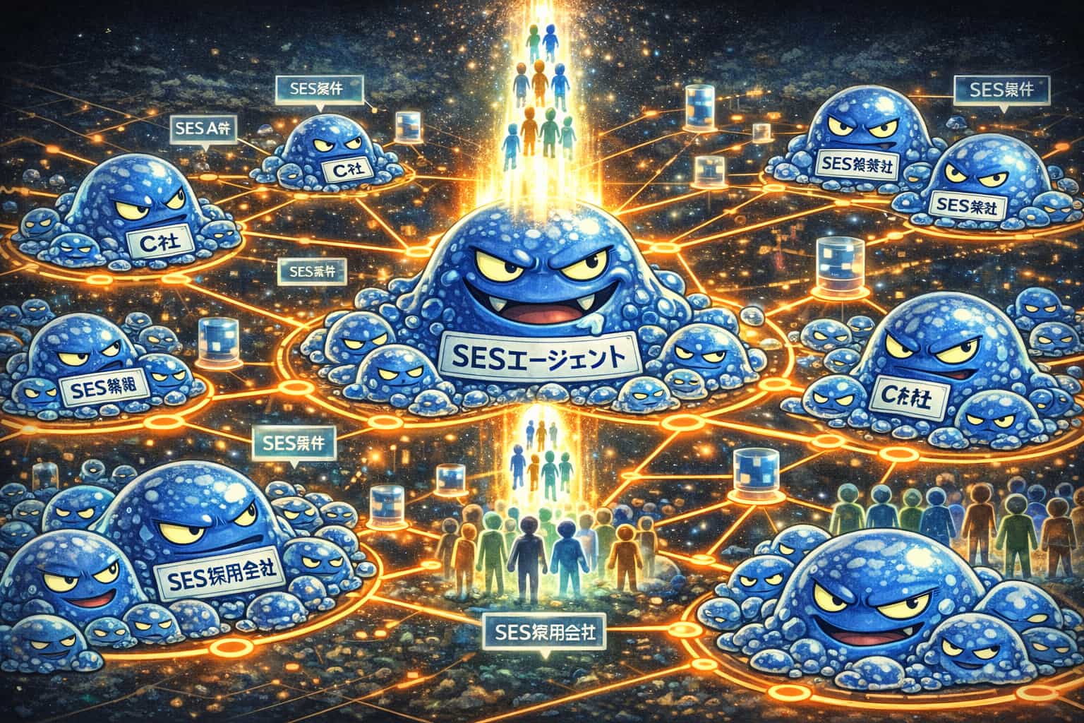 ともあれ、③エージェント型SESは、ネットワーク内の他のSES会社の人員を吸い上げ、さらに上位構造、SI業界や第三者評価業界、(エンジニアバブル期はWebサなども)に送る役割を果たしていました。
