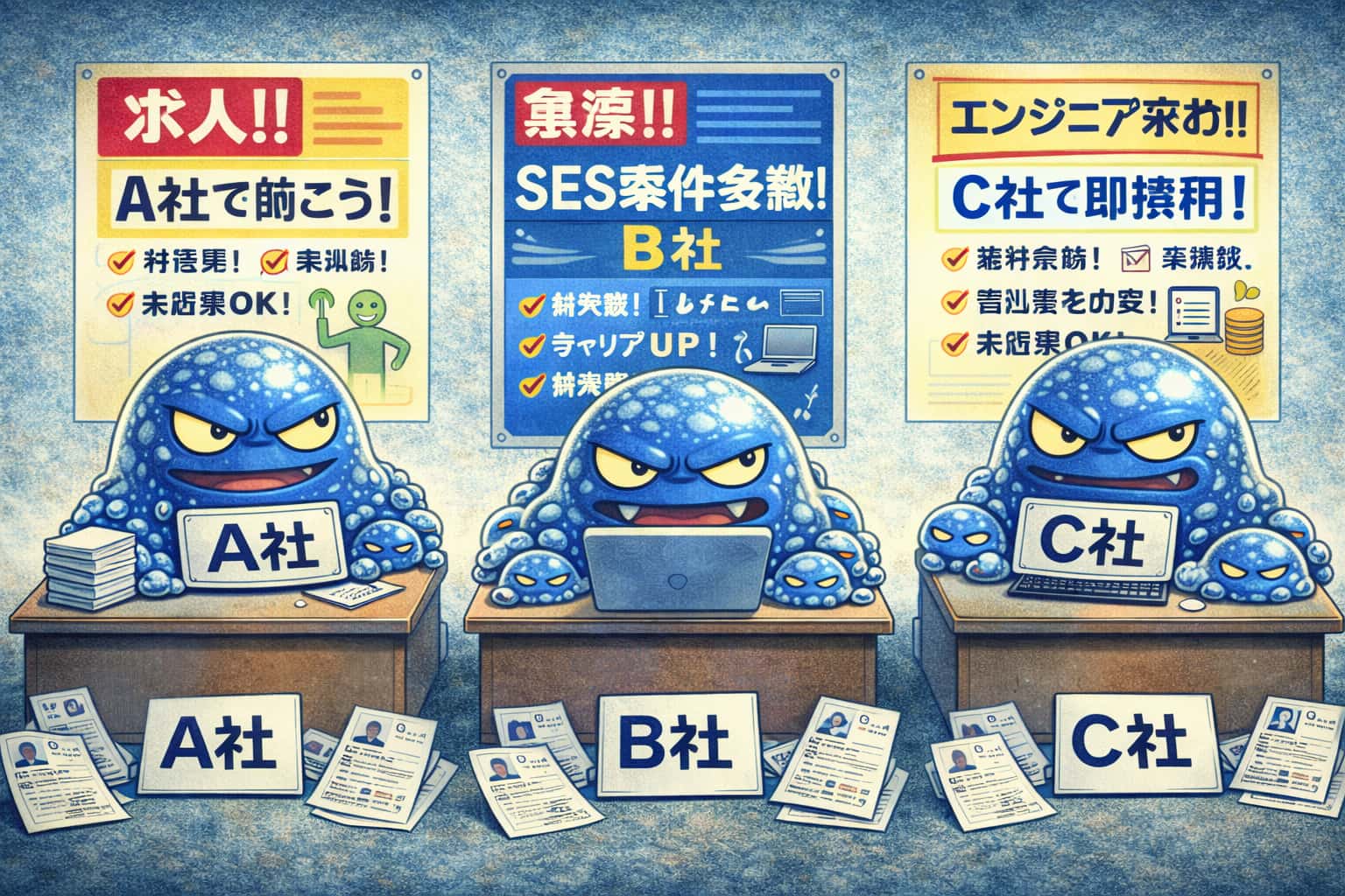現在のSES会社は在籍エンジニアの要望に沿ってエンジニアの派遣先を決めるタイプの会社が多いのですが、このタイプではエンジニア個人の要望が優先となるが故、会社全体の営業・技術的方針と言うものが存在しないことになります。(あったとして意味がないものになる。) 仮にSES、A社・B社・C社と3社あったとして、A・B・Cの間にほとんど差異はないことになります。