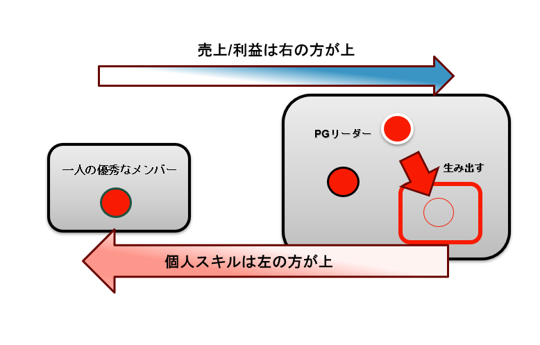 一人の優秀なメンバーの人月『1』と比較して、この経験3年のPGリーダーの方が利益を生む。初級PGのエンジニア人生の為にも有益な動きをしている。という事になります。