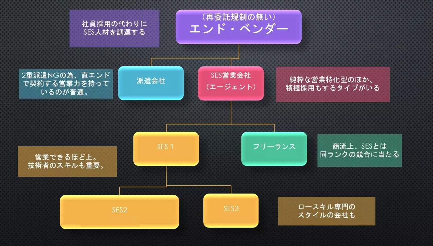 当然、会社によっても違いがあるが、コレらの発注企業は[外注人員を社員の様に使いたい](管理が要らないレベルの人材のみ単品派遣してほしい)と言うスタンスの会社が多く。所謂(箱売りをしたい)2次3次のソフトウェアベンダーとの相性がイマイチである。その為、準委任で派遣を行う業者。つまり、SES企業のほぼ独壇場となる。(なお派遣会社とは競合)