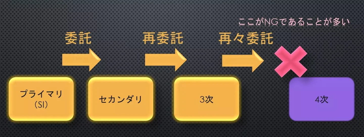 と、多重請負構造にならないようなルールが設定されていることが一般的です。(発注するSIer側がルールを設定している)